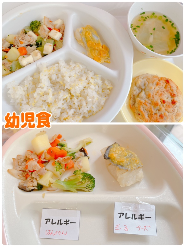【幼児】〇胚芽ご飯〇白身魚のコーンクリーム焼き〇コロコロソテー〇大根の味噌汁